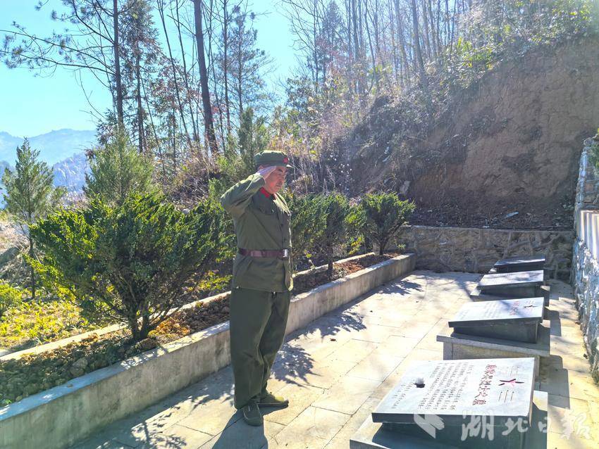 隊(duì)伍中,一位特殊的祭掃者引起了大家的注意,退役軍人唐生波來到他的爺爺——烈士唐家興的墓碑前,鄭重跪拜,行軍禮。