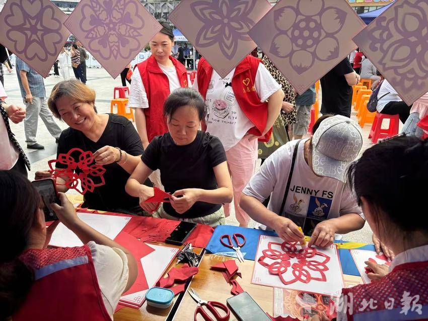 “注意剪刀力度的把握,沿著折疊的線條下刀……”剪紙、皮影體驗(yàn)區(qū),王女士在志愿者指導(dǎo)下,手起刀落,短短幾分鐘,剪出了團(tuán)花樣式?!昂苡腥ぃ吹阶约喊聂兆雍苡谐删透??!被?dòng)體驗(yàn)包粽子攤位上,捋葉、填米、封口、扎捆,清香的粽葉和晶瑩的糯米,通過(guò)一雙雙巧手,變成有棱有角的粽子。