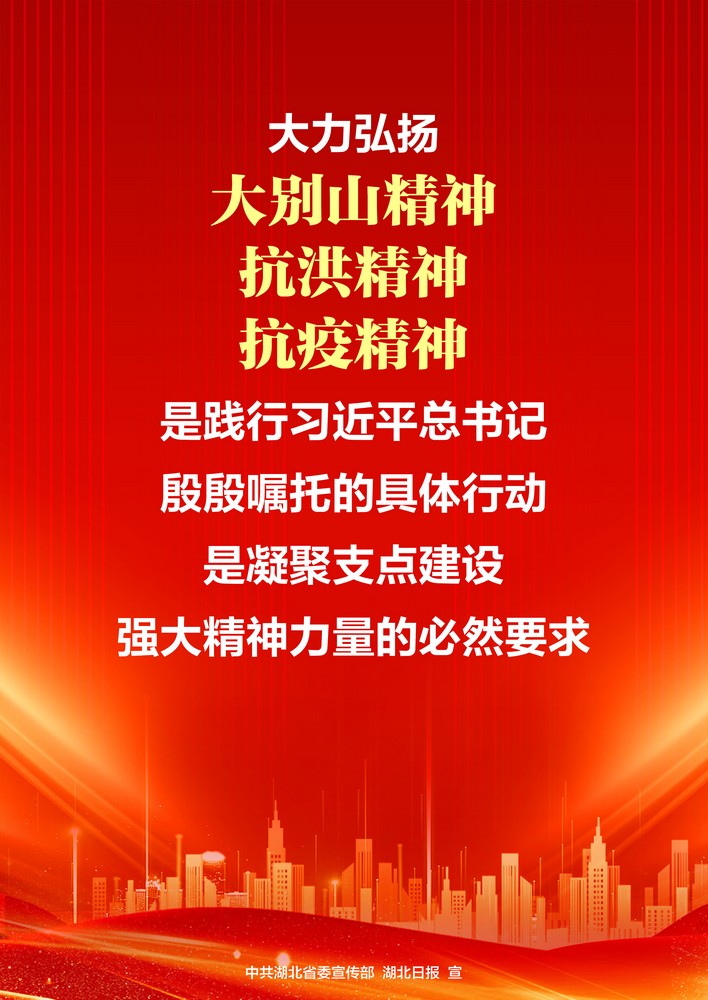 去年深秋,習(xí)近平總書記考察湖北時強(qiáng)調(diào),大力弘揚(yáng)大別山精神、抗洪精神、抗疫精神,廣泛踐行社會主義核心價值觀。這為我們在長江經(jīng)濟(jì)帶高質(zhì)量發(fā)展中奮勇爭先,加快建成中部地區(qū)崛起的重要戰(zhàn)略支點(diǎn),奮力譜寫中國式現(xiàn)代化湖北篇章,指明了要充分汲取的動力源泉,要廣泛匯聚的精神能量。