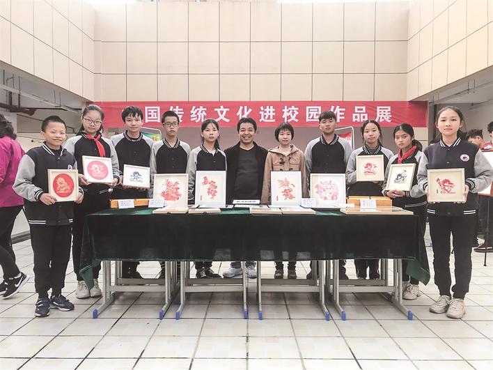 葛海(中)和學(xué)生參加傳統(tǒng)文化進(jìn)校園作品展 通訊員供圖