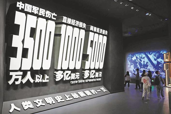 7月8日,參觀者在中國(guó)人民抗日戰(zhàn)爭(zhēng)紀(jì)念館參觀《為了民族解放與世界和平》主題展覽。(新華社記者 張晨霖 攝)