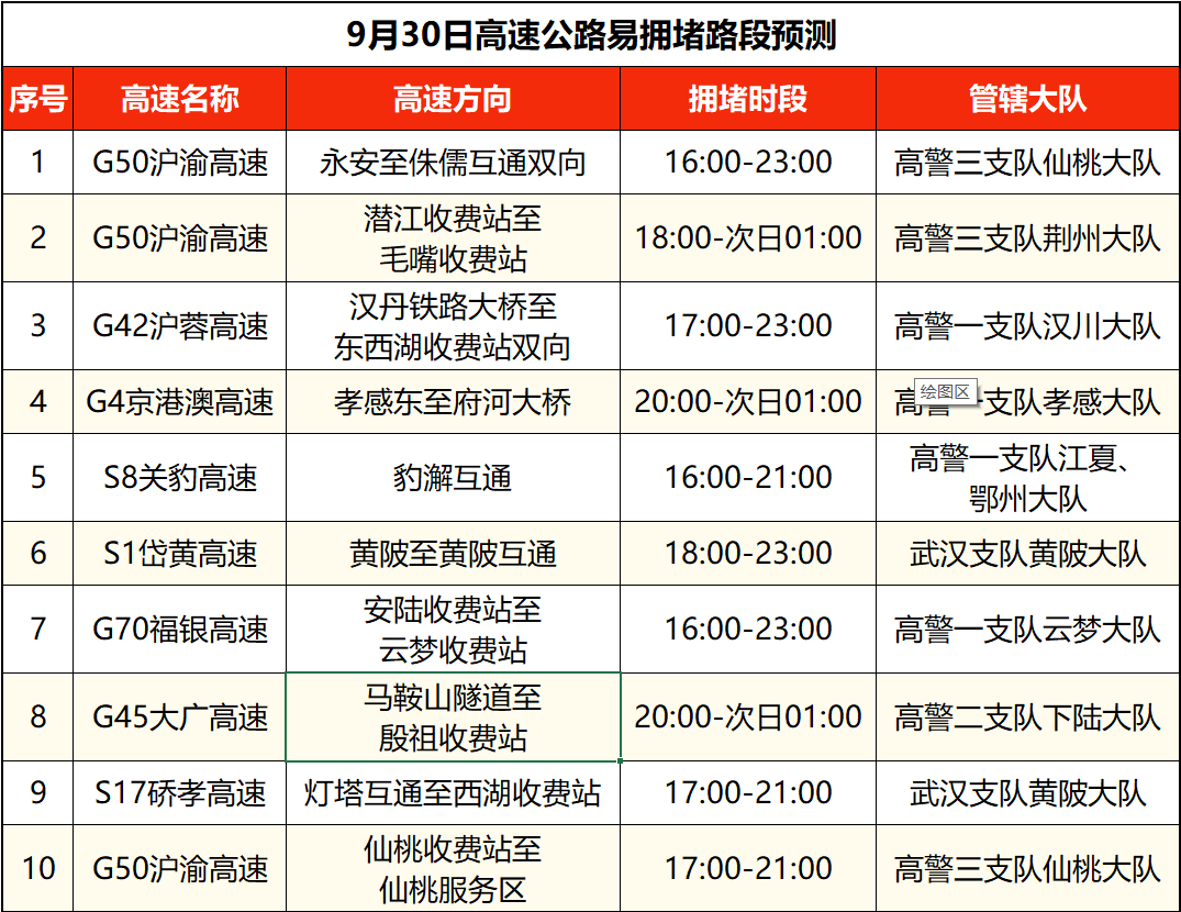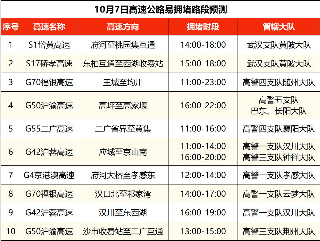 滬蓉高速漢川、當陽、鐘祥、黃陂段,滬渝高速仙桃、荊州、長陽、黃石、巴東、鄂州、恩施段,福銀高速云夢、隨州、十堰段,京港澳高速孝感段,武鄂高速鄂州段,武漢繞城高速江夏、蔡甸段,武監(jiān)高速武漢段,滬武高速江岸段,二廣高速襄陽段,呼北高速十堰段等高速路段擁堵風險高。