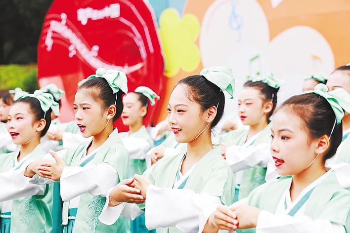 9月28日,“童聲嘹亮、唱響荊楚”2025年湖北省“童聲里的中國(guó)”少年兒童歌詠活動(dòng)集中展演在宜昌舉行。來自全省19所小學(xué)的900多名少年兒童用甜美的歌聲、優(yōu)美的舞姿,展現(xiàn)新時(shí)代少年兒童的蓬勃朝氣,表達(dá)了對(duì)祖國(guó)的熱愛。圖為麻城市第二實(shí)驗(yàn)小學(xué)學(xué)生在表演中。(視界網(wǎng) 黃翔 攝)