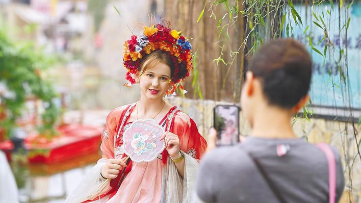 在專(zhuān)為黃金周設(shè)立的打卡點(diǎn)前,來(lái)自中東的姑娘杰漢·薩瓦德脫下雨衣,細(xì)致地整理裙擺,將栗色的長(zhǎng)發(fā)攏到胸前,對(duì)著鏡頭粲然一笑。