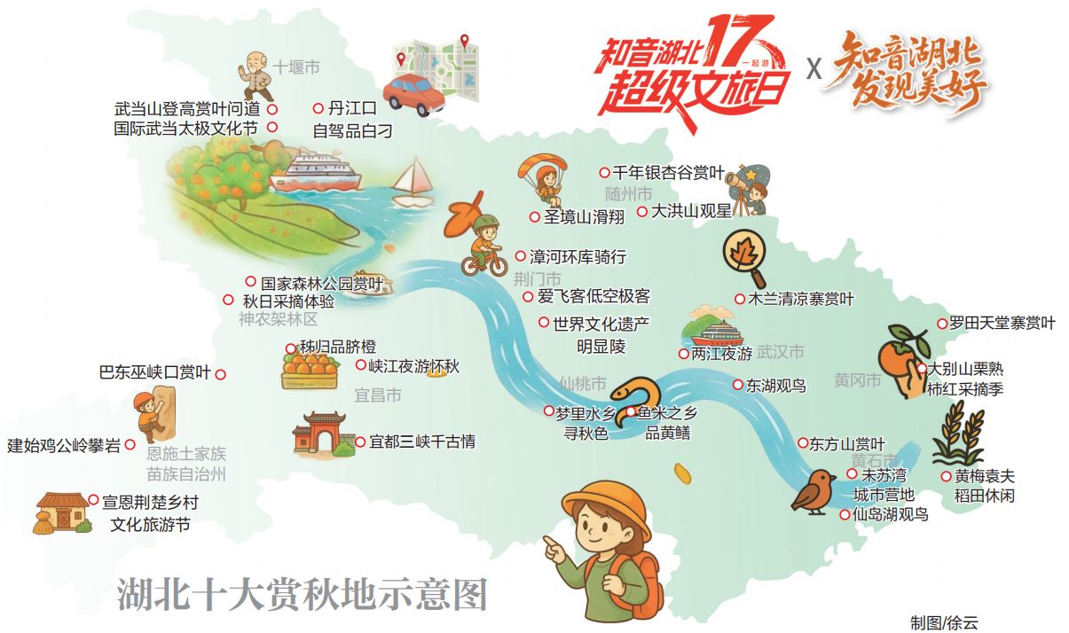 本次活動(dòng)重磅發(fā)布的十大賞秋地,是經(jīng)省文化和旅游廳與湖北日?qǐng)?bào)傳媒集團(tuán)“發(fā)現(xiàn)美好”聯(lián)合項(xiàng)目組推薦、精心篩選而來(lái)。十大目的地分別是:武漢(東湖觀鳥(niǎo)、兩江夜游、木蘭清涼寨賞葉);黃石(東方山賞葉、未蘇灣城市營(yíng)地、仙島湖觀鳥(niǎo));宜昌(峽江夜游懷秋、秭歸品臍橙、宜都三峽千古情);十堰(武當(dāng)山登高賞葉問(wèn)道、國(guó)際武當(dāng)太極文化節(jié)、丹江口自駕品白刁);黃岡(羅田天堂寨賞葉、大別山栗熟柿紅采摘季、黃梅袁夫稻田休閑);隨州(千年銀杏谷賞葉、大洪山觀星);荊門(mén)(圣境山滑翔、世界文化遺產(chǎn)明顯陵、愛(ài)飛客低空極客、漳河環(huán)庫(kù)騎行);恩施(巴東巫峽口賞葉、建始雞公嶺攀巖、宣恩荊楚鄉(xiāng)村文化旅游節(jié));仙桃(魚(yú)米之鄉(xiāng)品黃鱔、夢(mèng)里水鄉(xiāng)尋秋色);神農(nóng)架(國(guó)家森林公園賞葉、秋日采摘體驗(yàn))。