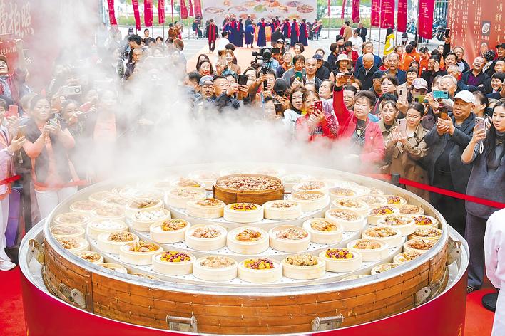 10月29日,重陽節(jié)上午,武漢市江夏燕爾閣藝術(shù)宴會中心蒸汽彌漫、竹香四溢。一場別開生面的“敬老楚宴·蒸愛江夏”非遺蒸菜銀發(fā)經(jīng)濟消費盛典在此舉行,直徑達4米的湖北原產(chǎn)巨型蒸籠揭開瞬間,將活動現(xiàn)場氣氛推向高潮。