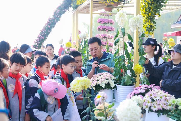 “揭榜掛帥”武漢特色菊花優(yōu)質(zhì)品種篩選及景觀應(yīng)用研究項目團(tuán)隊為青少年及市民普及菊花栽培、菊藝鑒賞。(受訪單位供圖)