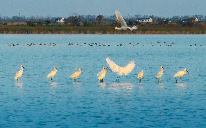 武漢沉湖濕地自然保護(hù)區(qū),國家二級重點保護(hù)動物白琵鷺在水面棲息。(湖北日報全媒記者 柯皓 攝)