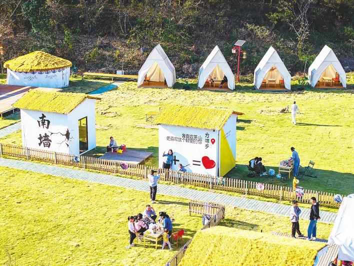 11月22日,英山縣方家咀鄉(xiāng)四棵楓村,游客及市民在碧楓港露營地打卡休閑,樂享冬日時光。近年來,英山縣充分利用鄉(xiāng)村生態(tài)資源優(yōu)勢,以現(xiàn)代文化藝術(shù)與傳統(tǒng)田園風(fēng)光相結(jié)合,積極打造集農(nóng)業(yè)休閑、生態(tài)游憩、鄉(xiāng)村文化于一體的精品鄉(xiāng)村生態(tài)旅游產(chǎn)業(yè),激發(fā)鄉(xiāng)村旅游消費(fèi)新活力。(視界網(wǎng) 王江 攝)