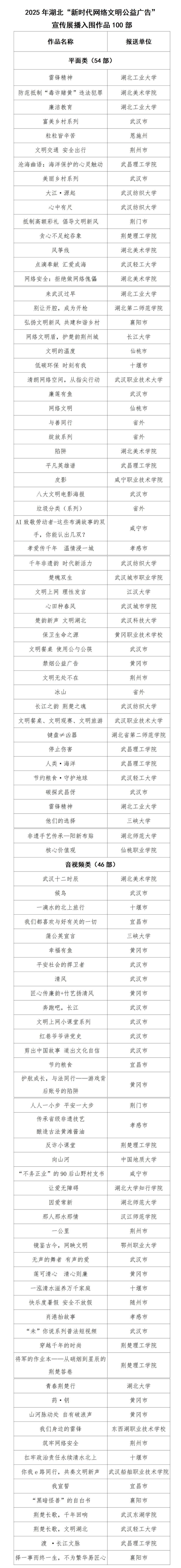 12月2日,2025年湖北“新時代網(wǎng)絡(luò)文明公益廣告”作品征集活動100部入圍展播作品揭曉,極目新聞現(xiàn)予以公布。