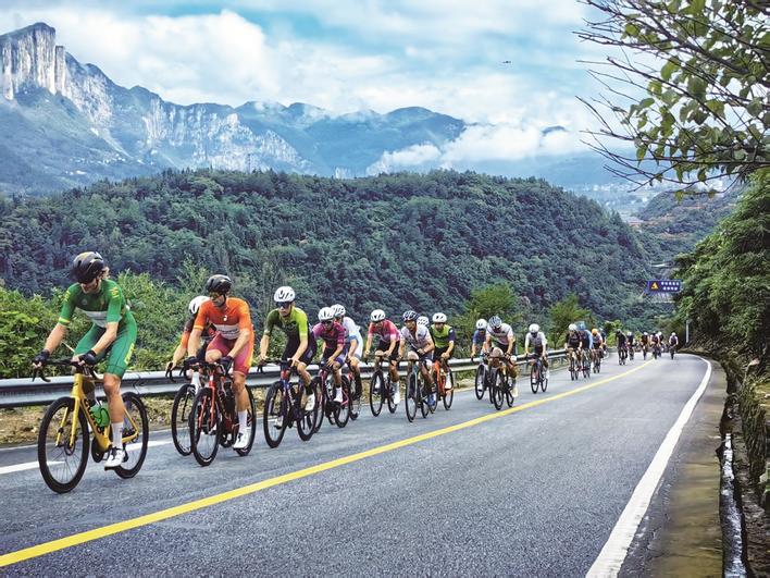 參加2025中國公路自行車公開賽的選手穿越恩施大峽谷—騰龍洞世界地質(zhì)公園。 (張瓏瀚 攝)